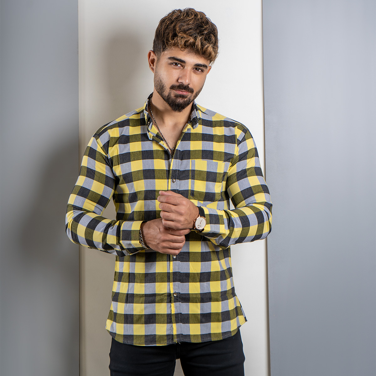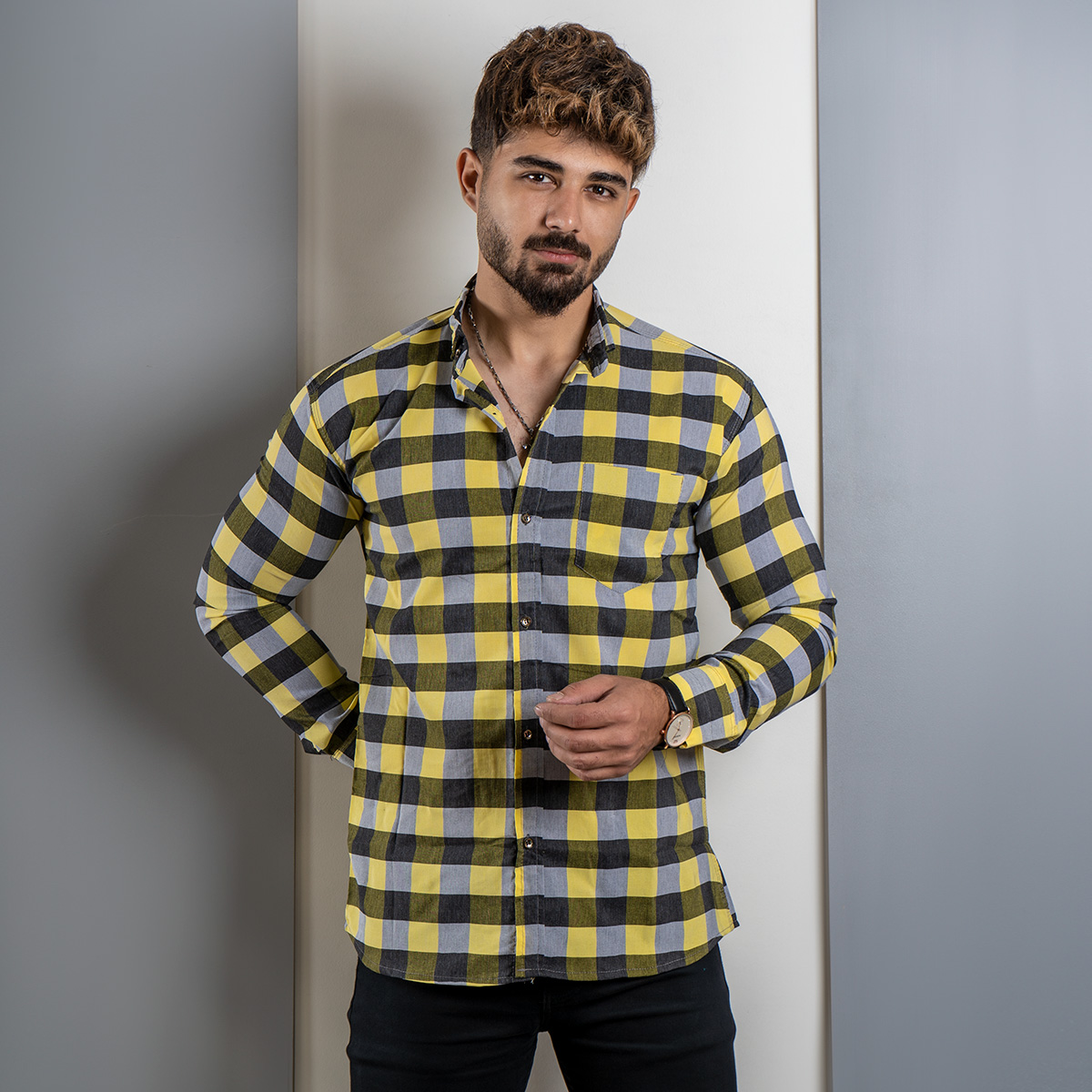 پیراهن چهارخانه زرد مردانه مدل unam