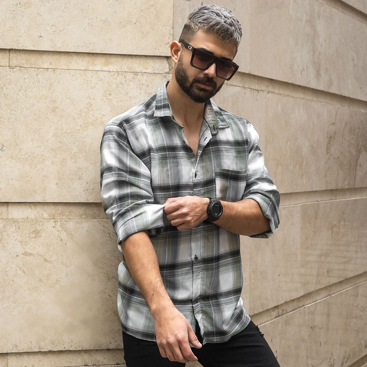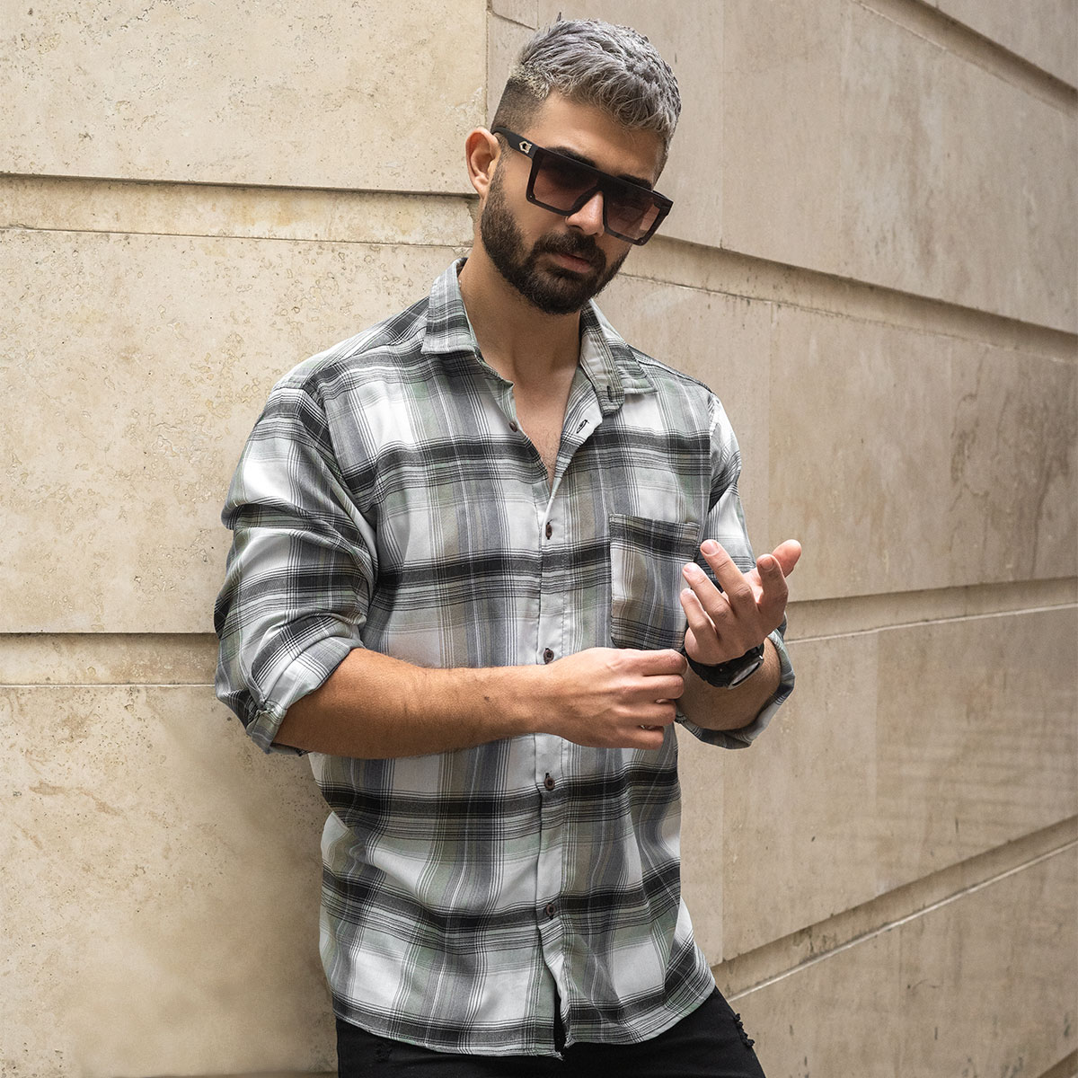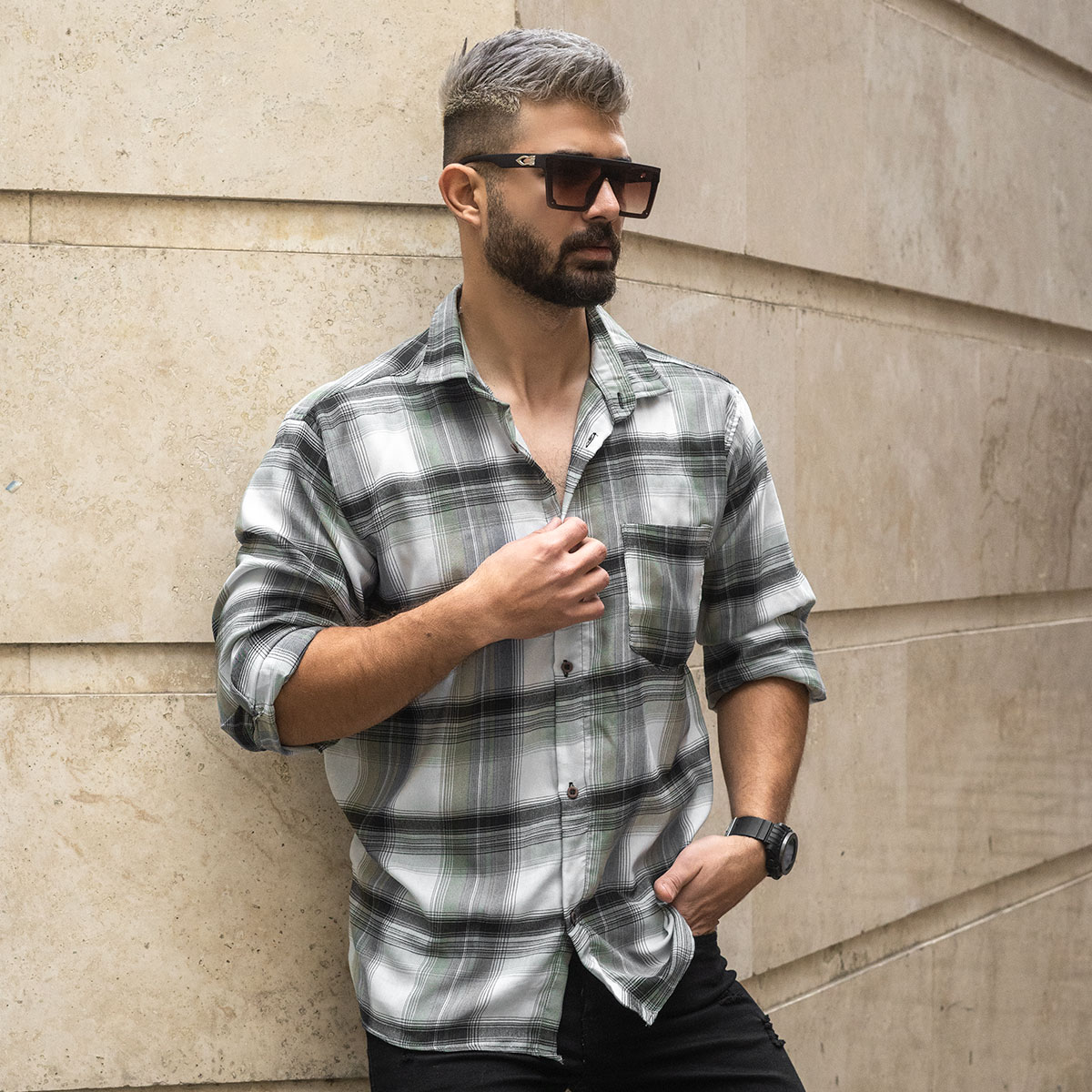 پیراهن مردانه چهارخونه سفید طوسی مدل alvand