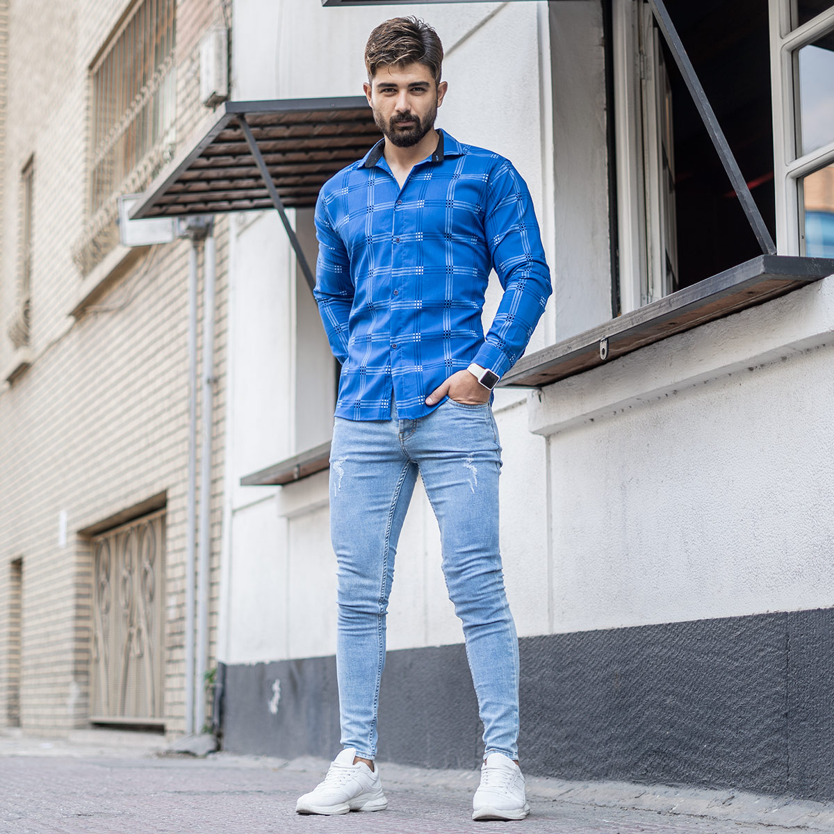 پیراهن چهار خونه آبی روشن مردانه مدل Siyam